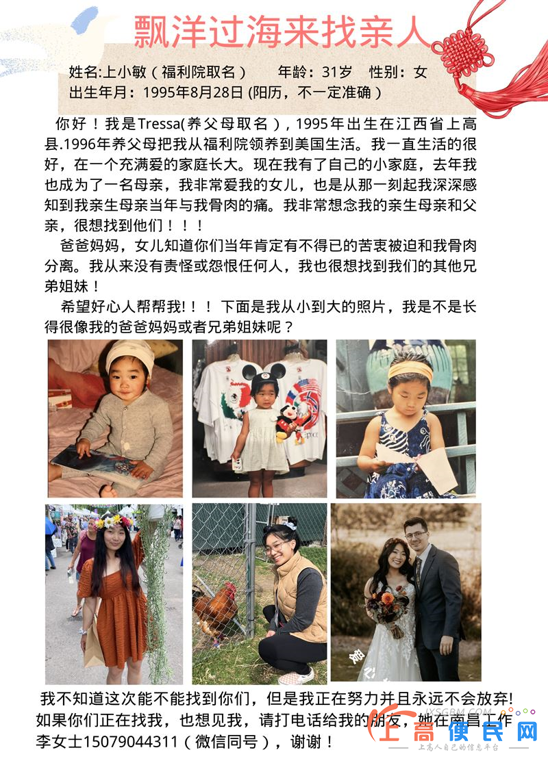 小敏經朋友介紹委托我幫助她尋找她上高的親生父母。小敏與親生父母分開后在上高孤兒院住過一段時間,后來被收養到國外,一直在國外生活。1995年8月28日左右出生的她,在自己成為媽媽的 那一刻,突然強烈的感受到自己的親生媽媽當年與她骨肉分離時的心痛,這讓她無法釋懷……