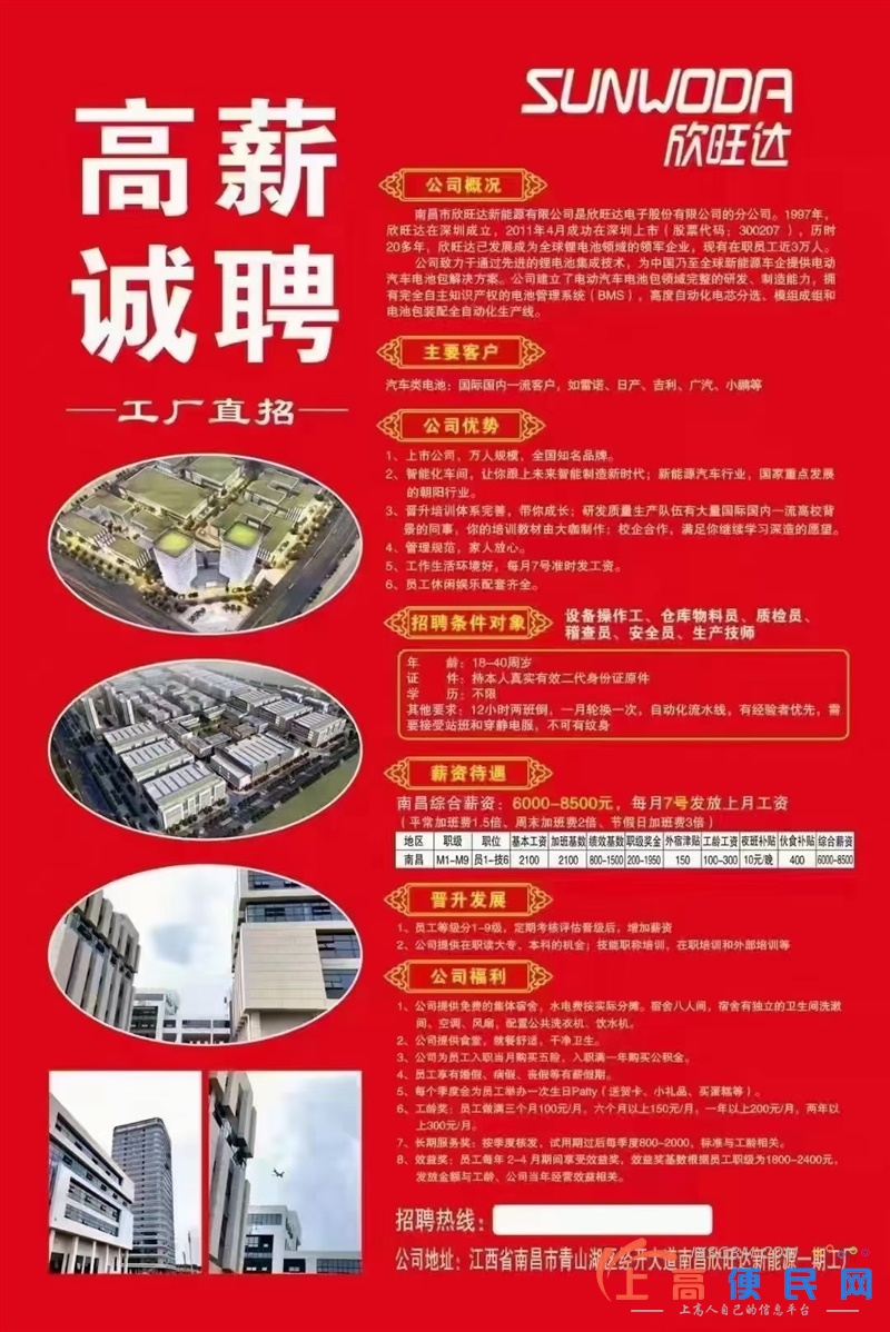南昌欣旺達開招!不用去外地!正式工同工同酬,發工資早,每月7號發上個月的工資!入職交5險,月薪6000—8500,?包吃包住!18—45歲男女不限,精裝4-6人間宿舍,新廠晉升空間大,招聘電話:18270957357
